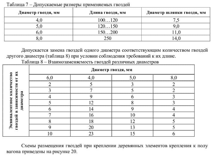 4.19 Для крепления деревянных подкладок, упорных, распорных брусков и рам к деревянному настилу полу вагона, к закрепляемому грузу. А также для соединения между собой деревянных элементов крепления применяют гвозди по ГОСТ 283. Размеры которых приведены в таблице 7.