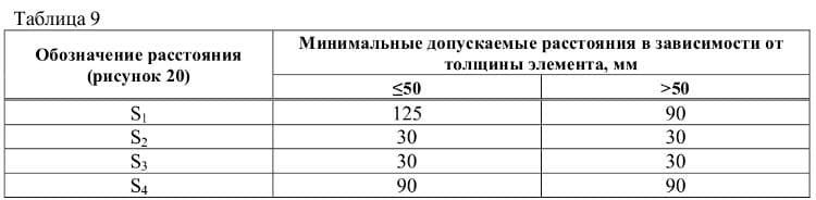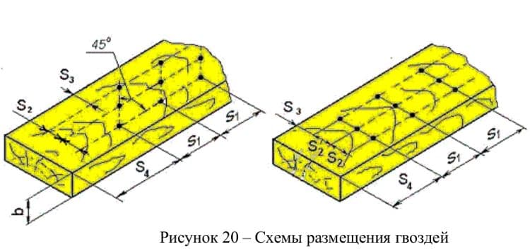 Минимально допускаемые расстояния между гвоздями. А также между гвоздями и кромками элементов в зависимости от толщины элементов приведены в таблице 9.