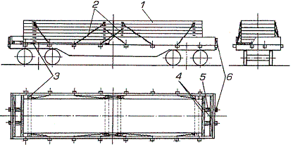 1 – плита; 2 – растяжка; 3 – подкладка; 4 – упорный брусок; 5 – распорный брусок; 6 – короткая торцовая стойка