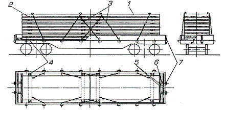Каждый штабель панелей ограждают двумя парами боковых стоек 3 длиной 1,8 м. Противоположные стойки увязывают между собой попарно проволокой 6 диаметром 6 мм в четыре нити. Торцовые борта платформы подкрепляют деревянными стойками